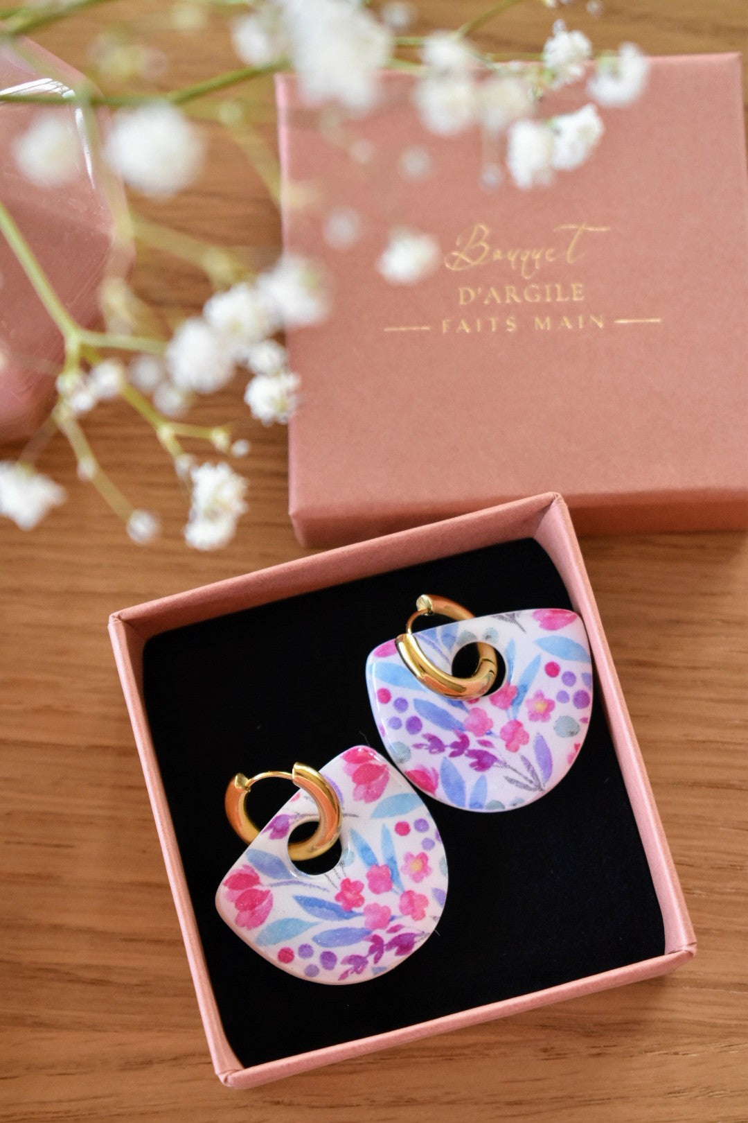 Paire de pampilles amovibles, modèle demi-cercle à motif floral rose, bleu et violet.
