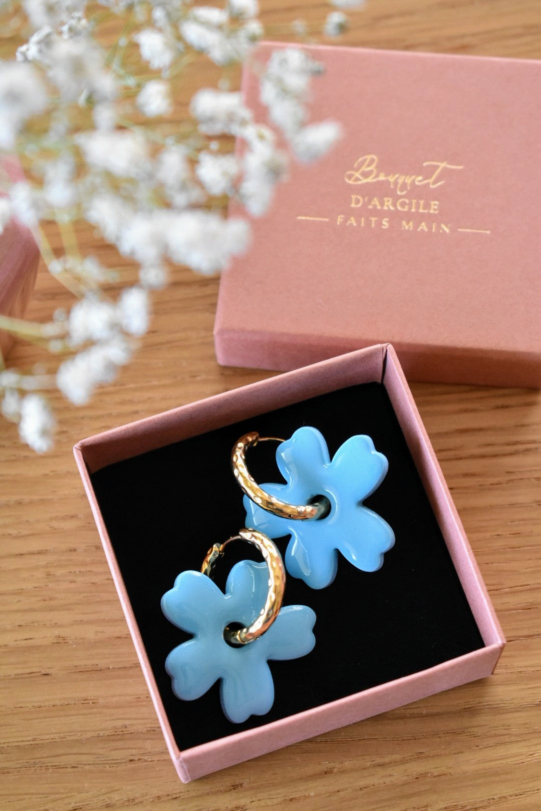 Toutes les boucles d'oreilles sont livrées dans une boîte à bijoux fabriquées à partir de carton certifié FSC® et de colle à base d'eau ou dans un pochon en coton biologique.