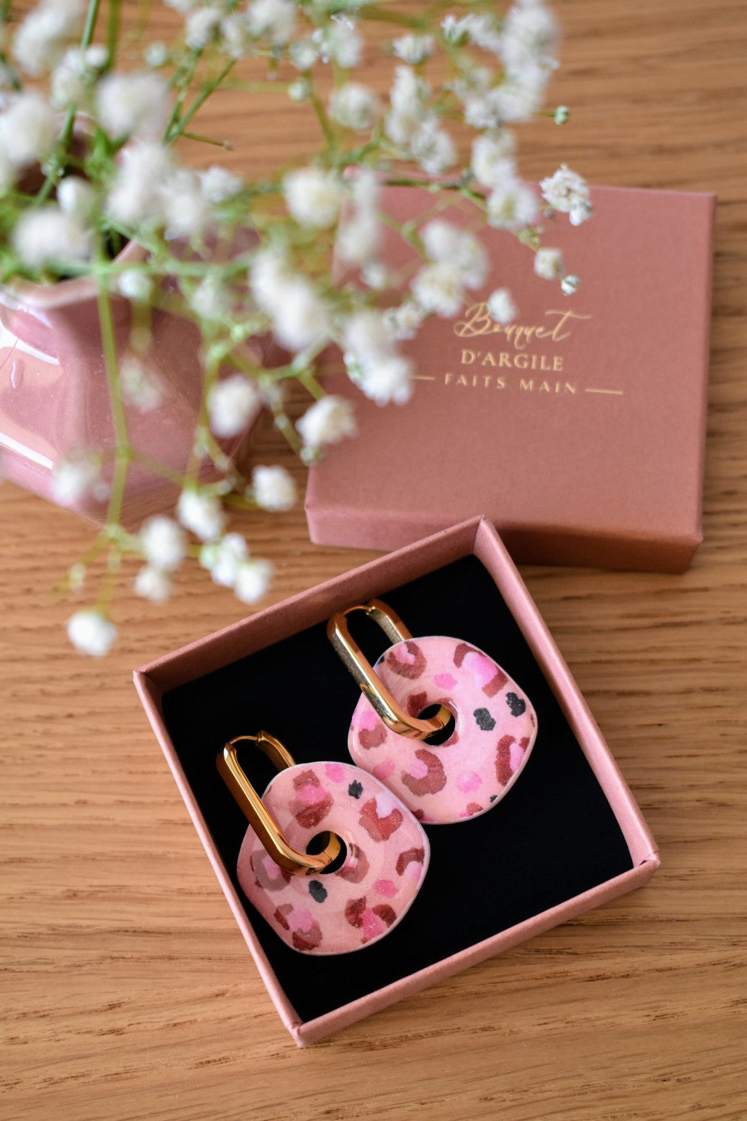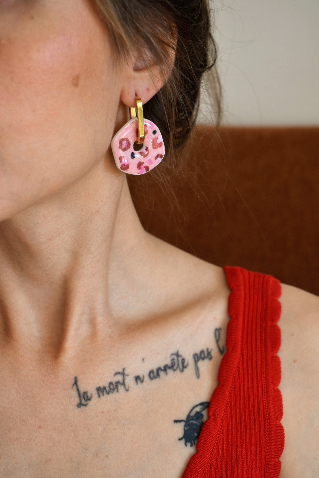 Paire de pampilles amovibles, forme organique, modèle motif léopard rose.