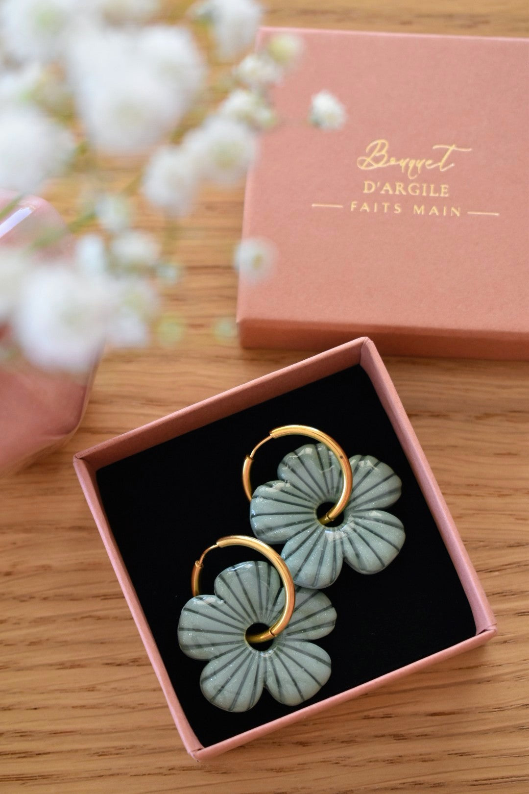 Toutes les boucles d'oreilles sont livrées dans une boîte à bijoux fabriquées à partir de carton certifié FSC® et de colle à base d'eau ou dans un pochon en coton biologique.