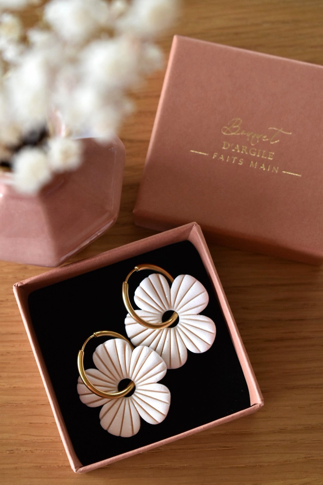 Toutes les boucles d'oreilles sont livrées dans une boîte à bijoux fabriquées à partir de carton certifié FSC® et de colle à base d'eau ou dans un pochon en coton biologique.