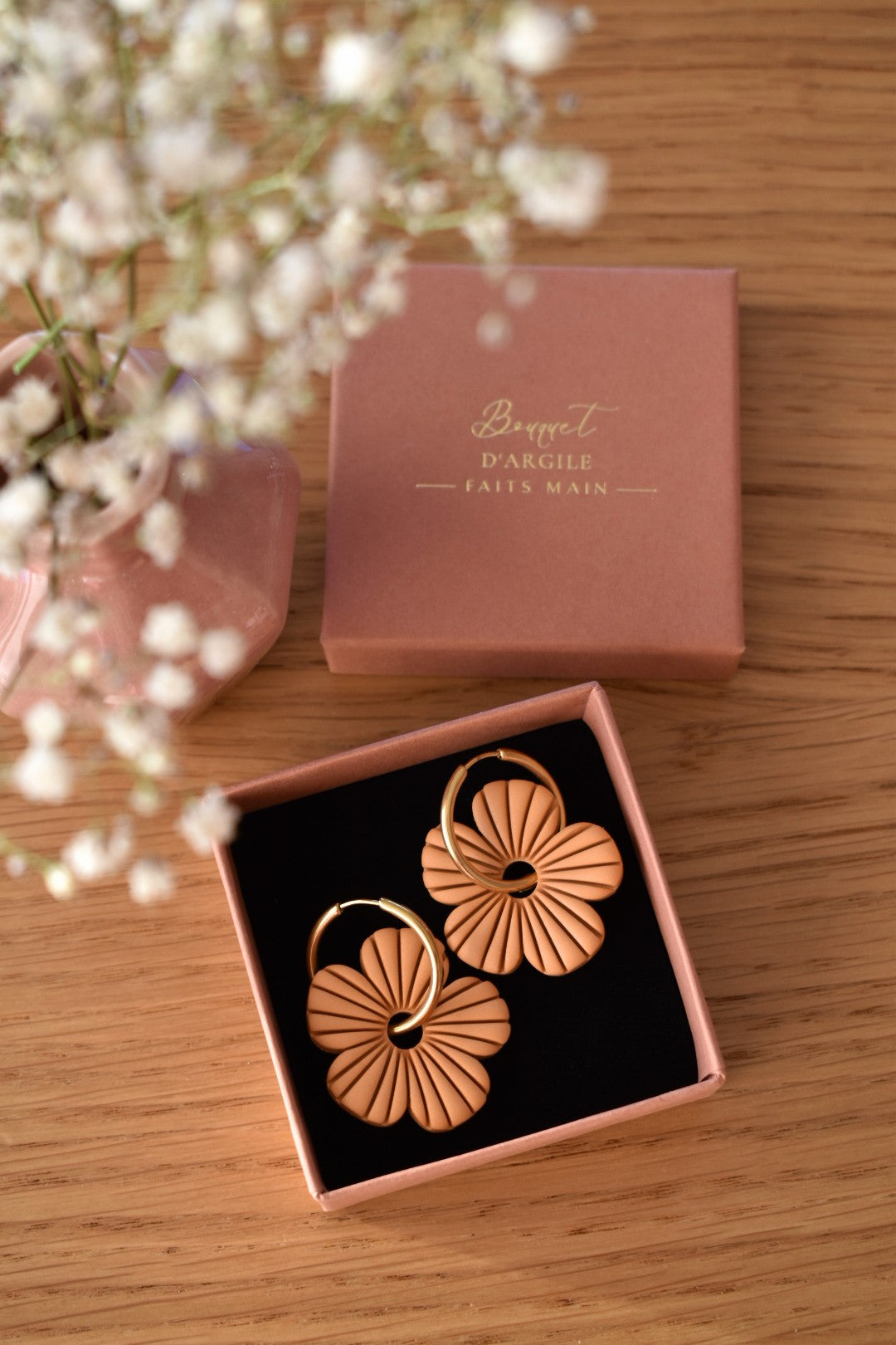 Toutes les boucles d'oreilles sont livrées dans une boîte à bijoux fabriquées à partir de carton certifié FSC® et de colle à base d'eau ou dans un pochon en coton biologique.