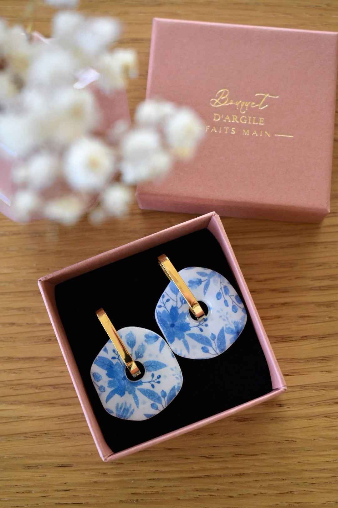 Paire de pampilles amovibles, forme organique, modèle motif floral bleu.
